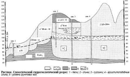 Как показано на рисунке, исследуемые воды циркулируют в отложениях неоген-четвертичного возраста, представленными мелко-, средне- и крупнозернистыми песками. Водоносный горизонт имеет свободную поверхность и типизируется как грунтовый. Воды безнапорные. Водоупором являются глины девонского возраста. Мощность неоген-четвертичного водоносного комплекса изменяется от 13-18 до 55 м. Движение грунтовых вод направленно, к р.Дон, где происходит их разгрузка. Питание подземных вод осуществляется за счет инфильтрации атмосферных осадков и паводковых вод р. Дон, реже за счет подтока из смежного девонского водоносного комплекса на участках размыва водоупора [1].