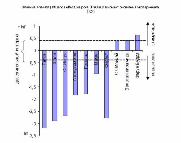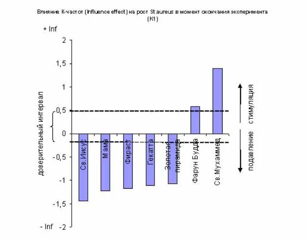 В результате удалось установить, что большинство использованных частот оказывают значительное угнетающее действие на культуру St. aureus. Слабо-стимулирующий характер К-воздействия достоверно проявился у всех трех кэн-оператовров только при работе частотой Фарун-будда. Недостоверные "выбросы" частоты Св. Мухаммед в область стимулирующего К-воздействия у оператора К1 следует отнести к артефактам вплоть до получения повторных схожих результатов на статистически достоверном уровне. При анализе первого блока графиков устойчивый эффект "отложенного подавления" регулярно отслеживался в работе оператора К3. Обязательная стартовая стимуляция роста культуры в сравнении с контролем, четко проявлялась в первые 3-5 часов роста культуры, тогда как типичный угнетающий характер К-воздействия на St.aureus начинал проявляться во второй фазе эксперимента где и обладал повышенной мощностью. Максимальной величины подавляющий эффект К-воздействия достигался во второй трети временного интервала наблюдения, тогда как до этого момента все частоты оператора К3 работали на слабую стимуляцию роста St. aureus.