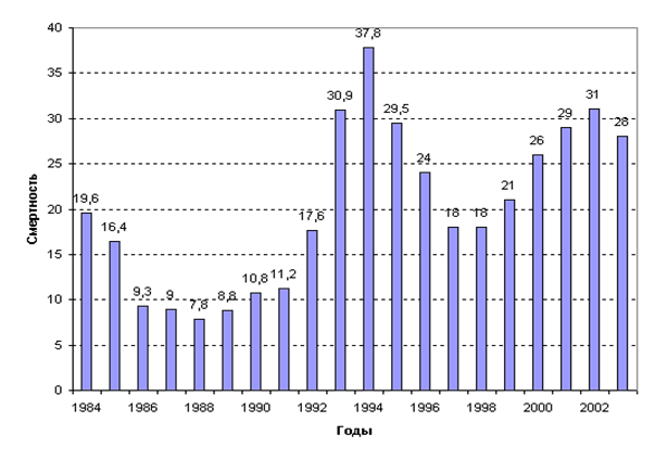 Рисунок 1. Динамика смертельных отравлений алкоголем в России (в пересчете на 100 тысяч населения)