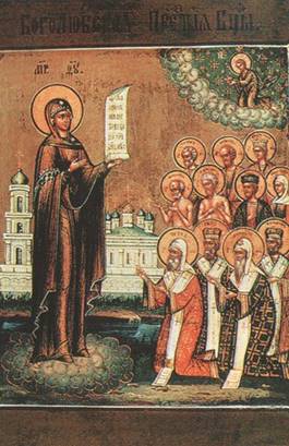 Боголюбивая Царице, / Неискусномужная Дево, Богородице Марие! / Моли за ны Тебе Возлюбившаго / и рождшагося от Тебе Сына Твоего, Христа Бога нашего, / подати нам оставление прегрешений, / мирови мир, земли плодов изобилие, / пастырем святыню и всему человечу роду спасение. / Грады наша и страны Российския от нахождения иноплеменных заступи / и от междуусобныя брани сохрани. / О Мати Боголюбивая Дево! / О Царице Всепетая! / Ризою Своею покрый нас от всякаго зла, / от видимых и невидимых враг защити // и спаси души наша.