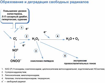 На рис. 2 представлено образование и деградация свободных радикалов и их участие в сосудистых осложнениях диабета.