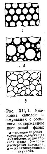 К концентрированным эмульсиям относятся системы жидкость — жидкость со сравнительно значительным содержанием дисперсной фазы, вплоть до 74 объемн.% (рис. XII, 1а). Эту концентрацию часто указывают как максимальную для эмульсий этого класса потому, что она в случае монодисперсной эмульсии соответствует максимально возможному объемному содержанию недеформированных сферических капель независимо от их размера. Так как концентрированные эмульсии получаются обычно методом диспергирования, то размер их капелек относительно велик и составляет 0,1—1 мкм и больше. Такие капельки хорошо видны под обычным микроскопом, и концентрированные эмульсии должны быть отнесены к микрогетерогенным системам.