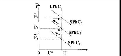 По-прежнему, сплошная вертикальная линия представляет долгосрочную интерпретацию кривой Филлипса (LPKC), отражающей уровень полной занятости, а пунктирные наклонные линии - ее краткосрочные варианты (SPhC).