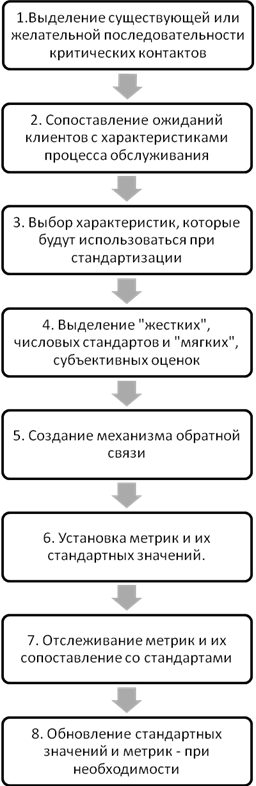 Услуга - это не вещь, а процесс, поэтому для введения стандартов обслуживания, нам необходимы методы числового измерения различных характеристик процесса обслуживания. Собственно, тут и все трудности со стандартами в сфере услуг. Выпуская кирпичи, мы можем установить стандарты на их прочность, вес, размеры - и все это можно измерить и выразить в числах. На конвейере мы даже можем поставить автоматическую систему контроля соответствия стандартам и отбраковывать все нестандартные изделия. Но в сфере услуг главным товаром являются межличностные коммуникации, которые люди до сих пор не научились достоверно описывать числами. Нет способов измерить в цифрах степень удовлетворенности клиента, невозможно достоверно определить в числах качество общения персонала с клиентом и т.д. Поэтому нам неизбежно придется прибегать к косвенным методам стандартизации - в сфере услуг мы не можем прямо стандартизировать сам процесс обслуживания, но только некоторые его аспекты, которые можно выражать числами. Например, один них - время ожидания обслуживания с момента заявки. Для очень многих видов услуг это полезная и легко измеряемая характеристика, которая может стать частью стандарта обслуживания.