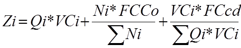 ABC- калькуляция предполагает распределение (FCco) пропорционально количеству заказов на товарные позиции (Ni), a (FCcd) пропорционально переменным затратам по товарным позициям (VCi). Исходя из этого принципа, автором предлагается следующая экономико-математическая модель определения издержек по товарным позициям: