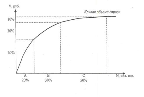 В этих условиях представляется необходимым выявление существующих взаимосвязей между характеристиками спроса и использование этих взаимосвязей для установления цен и управления товарным запасом фармацевтического предприятия. В этой связи предлагается использование матрицы товарных сегментов (ABCVXYZ - анализ), которая предполагает ранжирование всего ассортимента фармацевтического предприятия по показателю коммерческой привлекательности2. Коммерческая привлекательность товара для фармпредприятия определяется суммой реализации этого товара за определенный период времени. В свою очередь сумма реализации, зависит от двух составляющих - количества единиц реализованного товара и его цены продажи. Первая составляющая отражает рыночный спрос, вторая - интерес фармпредприятия в реализации более дорогого препарата. В соответствии с предлагаемой методикой товарный ассортимент фармпредприятия разбивается на товарные сегменты, каждому из которых присваиваются два индекса, в зависимости от роли в продажах предприятия: ABC - по признаку " объем реализации" и XYZ - по признаку "цена за единицу". При этом группа А - позиции, пользующиеся наибольшим спросом, В - позиции, занимающие среднее положение по этому параметру и С - позиции с умеренным спросом. К группе Z относятся самые дорогие препараты ассортимента, Y - умеренно дорогие и X - наиболее дешевые позиции. Практика функционирования фармацевтических предприятий показывает следующее соотношение между группами А, В, С (рис. 2).