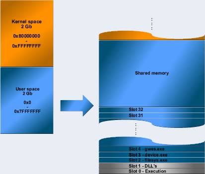 Пространство пользователя CE 5 разделено на 32 слота процесса, каждый занимает 32 МБ виртуальной памяти, и область разделяемой памяти, в которой любые процессы могут распределить виртуальную память. У этой архитектуры фактически есть свои корни в самых первых версиях Windows CE, разработанной уже более 10 лет назад. Ограничивая размер и максимальное число процессов, все процессы могут быть отображены в пространстве пользователя все время, очень уменьшая сложность ядра.