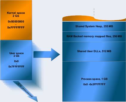 Вкратце, новая модель памяти дает возможность для запуска практически неограниченного числа процессов и под каждый процесс выделяется 2Гб виртуальной памяти. Чтобы учесть это, старая архитектура была заменена на новую, в которой только один процесс отображается в пространстве пользователя в любой момент времени.