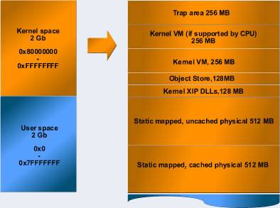 Хотя она выглядит довольно знакомо, две области по 512Мб не изменились, и ловушка пространства до сих пор там на вершине кучи, но есть некоторые важные изменения, которые следует отметить . Прежде всего область128Mb kernel XIP DLL непосредственно над 1GB , 128Mb зарезервированы для использования объекта Store. Сразу же после этого, имеются два слота по 256Mb виртуальной памяти ядра.
