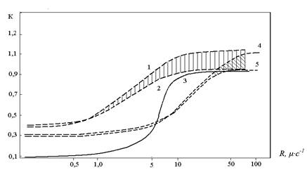 Достижение цели, обозначенной выше, удобно начать с рассмотрения зависимостей эффективного коэффициента распределения Кэф примеси Sn в системе Bi–Sn от скорости перемещения фронта кристаллизации R при разных значениях напряженности электрического поля Е, вызывающего ток через расплав и глубины диффузии δ по экспериментальным данным [3]. Эти зависимости приведены на рисунке, на котором зависимость 1 отвечает процессу Е = 1в·см-1, δ = 0,4D; кривые 2,4 – значениям Е = 1В·см-1, δ = 0,1D и Е = -1В·см-1, δ = 0,4D соответственно, где D – коэффициент диффузии примеси в расплаве. Кривые 3,5 были рассчитаны по теории Прима-Бартона-Слихтера при Е = 0, δ→0 и теории процесса [4] с электропереносом в расплаве, так что Кэф = Кэф (К0,Е, δ), где К0=Кэф min.