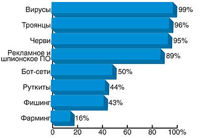 Рис. 1. Виды вредоносного ПО, с которым сталкивались участники опроса, проведенного компаниями Softline и Symantec в октябре 2007 года