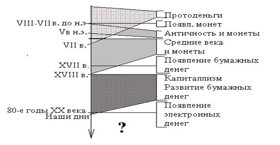 Несмотря на обширность материала, всю историю развития денег можно разделить на несколько этапов, представленных на следующей диаграмме.