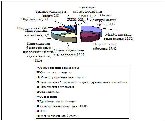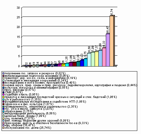 Бюджетные расходы идут на такие основные статьи, как национальная оборона и содержание государственного аппарата; финансирование хозяйства; финансовое обеспечение социальной инфраструктуры (здравоохранение, социальное обеспечение, просвещение, наука и т.д.); выплата процентов по государственному долгу.