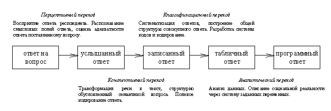 Процесс работы с открытыми ответами можно разбить на серию переходов, которые задаются особенностями опросного инструмента (рис. 1).