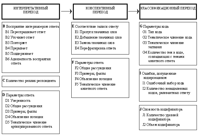 На этапе перцептивного перехода артикулированный ответ претерпевает существенное изменение. Как бы ни пытался интервьюер придерживаться стандартов формализованного интервью, он не может элиминировать собственное участие в опросе и невольно становится соавтором ответа, хотя бы при регулировании его соответствия вопросу. Для поддержания продуктивной коммуникации интервьюер не может молча записывать ответ, а вынужден выражать одобрение усилиям респондента формулировать релевантные суждения, комментировать уход от ответа или задавать уточняющие вопросы. Все это приводит к тому, что услышанный интервьюером ответ уже не соответствует первоначальным репликам респондента. На этапе конспективного перехода изменяется услышанный ответ. Несмотря на то, что большинство инструкций требуют точной записи ответов, интервьюер не всегда может это сделать. В одном случае ответ может перерасти в рассуждения, которые физически невозможно записать полностью. В другом — респондент может отклониться от семантического задания вопроса: продолжать отвечать на один из предшествующих вопросов, неправильно понять формулировку или начать рассказывать о собственной жизни — тогда интервьюер должен вернуть его к теме. В результате не все, что говорит респондент, попадает в анкету. Классификационный переход имеет место в процессе кодирования записанного ответа. Проконтролировать соответствие выбранных кодов записям в анкете достаточно сложно. Аналитический переход состоит в конструировании вторичных переменных и создании осмысленных типологий. К. Бейли выделяет две характеристики, позволяющие определить типологию как отдельную исследовательскую задачу: это многомерность и концептуальность [2, p. 4]. Под многомерностью понимается наличие множества переменных; под концептуальностью — зависимость типологии от целей и теоретических допущений исследования. В настоящем исследовании мы ограничиваемся операционализацией первых трех переходов (рис. 2).