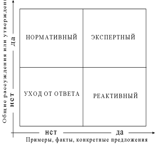 21 Однозначные реплики встречались в 22% нормативных ответов и 34% реактивных. Способ определения экспертного ответа (присутствие фактов и общих суждений) делает невозможным его представление с помощью одной фразы. Более того, экспертный тип ответа, гораздо чаще представлен длительными рассуждениями — 21% случаев, нормативный — 4%, реактивный — 2%.