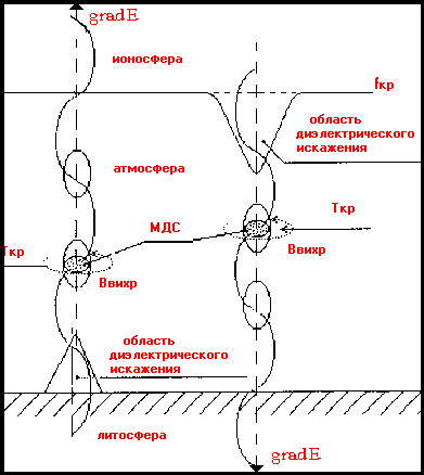 Эллиптические фигуры вытянутой формы обозначают области поляризации аэрозолей (заштрихованные фигуры внутри эллипсов - области наведения МДС, совпадающие с высотами критических изотерм спонтанного плазмообразования).