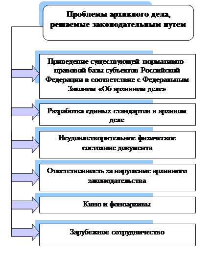 Сегодня совершенно необходима кропотливая работа приведения существующей нормативно-правовой базы субъектов Российской Федерации в соответствие с Федеральным Законом «Об архивном деле». Проблема заключается в том, что некоторые субъекты федерации имеют собственные законы, которые до сих пор не приведены в строгое соответствие с нормами Федерального законодательства. К ним относятся законы таких регионов как Татарстан, Башкортостан, Удмуртия, Новосибирская и Московская области, город Москва.