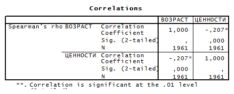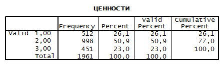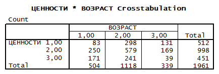 Распределение по возрасту: 1 группа – меньше 30 лет, 2 группа – от 30 до 60, 3 группа больше 60 лет. Группы для веры и ценностей аналогично первой и второй таблице.