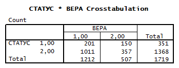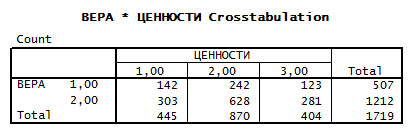 В этой таблице показано разделение респондентов на верующих и неверующих, к первой группе относятся верующие, а ко второй не религиозные люди.