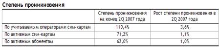 По данным MForum Analytics, количество активных абонентов в РФ по итогам 2Q 2007 года составило около 90,0 млн., что составляет всего 56,2% от заявляемого сотовыми операторами количества учитываемых сим-карт. Степень проникновения по активным абонентам в РФ по итогам 2Q 2007 года достигла уровня 62,0%.