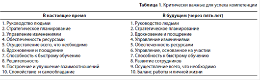 Для более глубокого понимания ситуации с развитием компетенций нам бы хотелось конкретизировать критически важные компетенции для успеха руководителей сегодня и через пять лет, выбрав лишь 10 самых важных из 20 оцененных (табл.1).