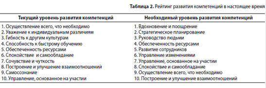 В табл.2 приведен рейтинг текущего уровня развития компетенций по мнению респондентов и рейтинг компетенций, необходимый для максимальной эффективности и успеха в современных условиях.