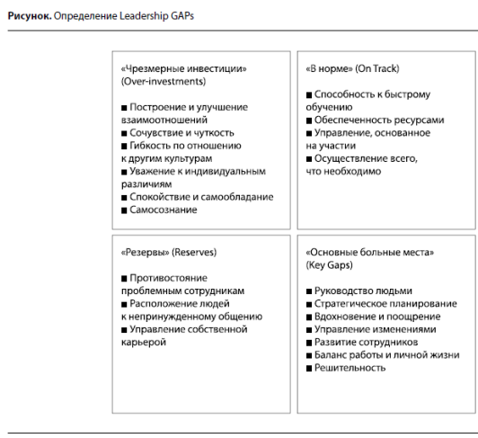 дения и стратегии организации; оценка требуемых навыков, способностей и компетенций для воплощения стратегии; понимание дефицита требуемых компетенций. Именно здесь пригодится инструмент Leadership GAP Indicator.