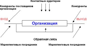 Внешняя среда предприятия включает микросреду и макросреду. Микросреда предприятия — это те субъекты, с которыми предприятие постоянно и непосредственно взаимодействует: это покупатели, поставщики, конкуренты, партнеры, контактные аудитории (спонсоры, средства массовой информации, консультанты, банки) и государственные органы. Взаимоотношения между предприятием и субъектами микросреды равноправные — как они могут оказывать влияние на предприятие, так и предприятие может оказывать влияние на них.