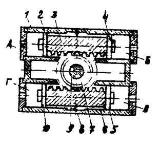 При повороте вала на один оборот происодит переключение каналов по следующему циклу: I−IV−VII−VI−II−I. Следовательно, за один оборот ротора у гидромашин происходит шесть рабочих циклов при семи циклах распределителя.