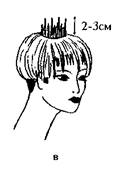 Ориентируясь на длину челки, подстригаем волосы верхней зоны, забирая их горизонтальными прядями (рис. в). Укладку выполняют, поднимая волосы наверх.