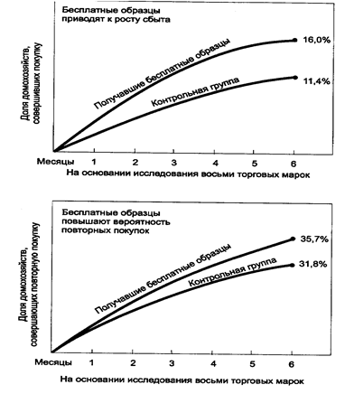 Дополнительным подтверждением эффективности предоставления потребителям бесплатных образцов являются результаты исследования влияния бесплатного опробования при выведении на рынок новых товаров. На рисунке 2 приведены обобщенные данные аналитической фирмы NationalPanelDiary по восьми наименованиям новых продуктов: при представлении одних новинок распространялись бесплатные образцы, а при представлении других — нет. Влияние бесплатных образцов можно оценить, сравнивая эти две группы {товаров. Верхний график отражает результаты пробных или первых покупок. Видно, что из домохозяйств, получивших бесплатный образец товара, пробную покупку совершили примерно на 50 % больше, чем из контрольных домохозяйств (не получавших бесплатные образцы). Более того, как показано на нижнем графике, те, кто совершил покупку после получения бесплатного образца, чаще совершали покупку снова.