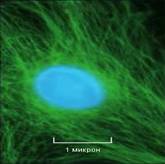 Рис. 1. Слева – строение микротрубочки, справа – цитоскелет, образованный микротрубочками, в клетке соединительной ткани – фибробласте. Микротрубочки окрашены зеленым, ядро – голубым