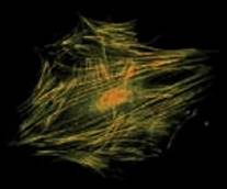 Рис. 2. Слева – строение микрофиламента, справа – цитоскелет, образованный микрофиламентами, в фибробласте. Микрофиламенты окрашены желтым