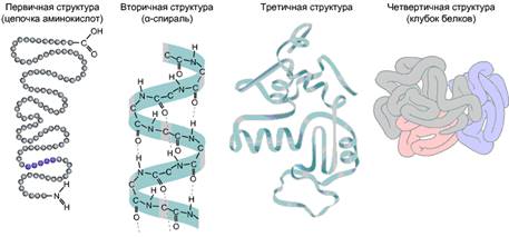 Вторичная, третичная и четвертичная структура белка определяется его первичной структурой. В зависимости от последовательности аминокислот в полипептидной цепочке будут образовываться α-спиральные или β-структурные участки, которые затем самопроизвольно «уложатся» в определенную третичную структуру, а у некоторых белков отдельные цепочки еще и объединятся с образованием четвертичной структуры.