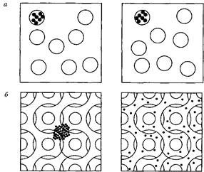 В доменах, связанных между собой на макроскопических расстояниях, молекулы растворителя могут быстро смещаться на большие расстояния. Молекулы растворителя, заключенные в дискретные или замкнутые домены, диффундируют очень медленно, а – Набухшие вследствие со-любилизации мицеллы или капельки микроэмульсии типа «масло в воде»; б – биконтинуальные структуры. Точки представляют меченые молекулы в начальный момент времени и через некоторое время.