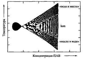 На рис. показаны микроструктуры для неионогенных ПАВ. Картина будет аналогичной и для ПАВ других типов, если температуру заменить на концентрацию соли для ионогенных ПАВ.