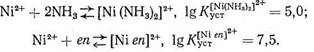 Как известно, особая устойчивость комплексных соединений, образованных ионами металла с полидентатными лигандами, объясняется образованием одной молекулой (или ионом) лиганда с данным центральным ионом (катионом металла) одного или нескольких хелатных циклов. Согласно правилу Чугаева, наиболее устойчивыми являются пятичленные хелатные циклы (для систем без кратных связей) и шестичленные циклы (для систем с сопряженными двойными связями). Напомним, что энергетическая выгодность замыкания хелатных циклов (хелатный эффект) определяется как энтропийным, так и эн-тальпийным факторами. Рассмотрим в качестве примера комплексообразование Ni2+