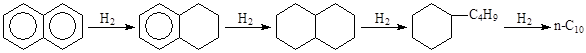 Важное место среди процессов гидрокрекинга, позволяющих получить средний дистиллят в качестве дизельного топлива с пониженной плотностью и повышенным цетановым числом занимают процессы гидрирования полициклических ароматических соединений и последующего гидрогенолиза полученных нафтенов (раскрытие циклов) без потери молекулярной массы нафтенов, например,