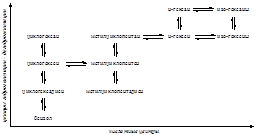 Риформинг используют для получения из нафты (температура кипения 80 – 160оС) высокооктановых бензинов и ароматических соединений, которые экстрагируют из бензинов и используют в качестве сырья для гидрокрекинга или для органического синтеза. Процесс проводят в интервале 380 – 520оС при давлении 10 – 40 атм на гетерогенных бифункциональных катализаторах – металлических и кислотных – Pt на промотированном Cl– или F– оксиде алюминия (или алюмосиликате). В последнее время используют Pt-Re/Al2O3 или полиметаллические катализаторы на Al2O3. Основной проблемой в процессе риформинга является процесс дезактивации и закоксовывания катализатора. Наличие Pt и, особенно, Re способствует уменьшению коксообразования по сравнению с процессом каталитического крекинга на алюмосиликатах – происходит гидрирование отлагающегося на носителе кокса и полимерных пленок. На рисунке представлена упрощенная диаграмма реакций (на примере превращений С6-углеводородов), развивающихся на кислотных центрах (вдоль оси абсцисс) и на металлических центрах (вдоль оси ординат):