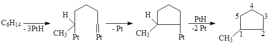 Гидрогенолиз связей 2-3, 3-4 и 4-5 приводит к продуктам скелетной изомеризации н-алканов.