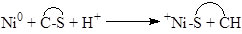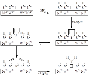 Из уравнений (12) и (13) следует, что оба процесса – гидрогенолиз (9) и гидрирование бутена (11) происходят на разных центрах катализатора. Механизм реакции пока не ясен, однако упрощенная стадийная схема включает активацию Н2 на металле восьмой группы (Ni2+, Co2+) и адсорбцию тиофена на анионной вакансии, связанной с Mo(III) или W(III). Восстановленные атомы Ni(0) и осуществляют разрыв связи C-S: