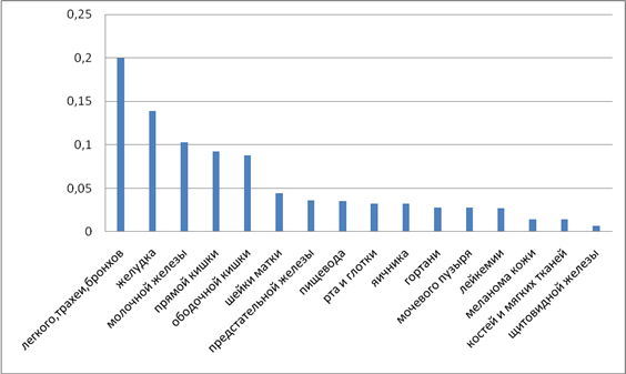 Мною была исследована первичная онкологическая заболеваемость и смертность населения, проживающего в районах с различным уровнем загрязнения атмосферного воздуха. Выявлены достоверные различия в уровне заболеваемости злокачественными новообразованиями и смертности изучаемых районов.Высокий уровень онкопатологии совпадает с высоким уровнем загрязнения атмосферного воздуха. Если сравнивать две карты, то можно увидеть зависимость: территориям с высоким уровнем загрязнения атмосферы соответствуют территории с наивысшими показателями заболеваемости населения. Учитывая тот факт, что в структуре заболеваемости первое место принадлежит заболеваниям органов дыхания (20%), можно делать вывод, что существует прямая зависимость повышенного заболевания онкологическими новообразованиями и уровнем загрязнения атмосферного воздуха.