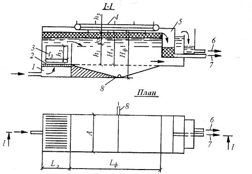 Рис.3. Горизонтальний електрофлотатор: 1 – подача стічної води;5 – піно збірник; 2 – решітка-заспокоювач;6 – відвід очищеної води; 3 – електродна система;7 – відвід пінного шламу; 4 – скребачка;8 – випуск осаду