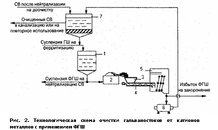 В реакторе ферритизации 1 после обезвреживания гальваношлама образуется суспензия ФГШ, которая разделяется на два потока. Часть суспензии подается в реактор нейтрализации гальваностоков в целях сокращения расхода Са(ОН)2