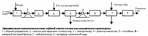 Из отстойника гальваностоки направляются на напорный песчаный фильтр для глубокой доочистки от ионов тяжелых металлов, нейтрализацию, а далее в резервуар технической воды, откуда возвращаются в производство.