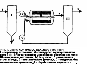 Модельная сточная вода освобождалась от взвешенных веществ в первичном отстойникеного отстойника с помощью насоса V перекачивался обратно в биосорбер II.