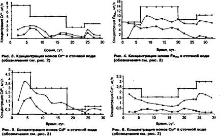 Результаты экспериментов свидетельствуют об очевидном превосходстве биосорбционного способа очистки над биологическим по всем контролируемым параметрам (рис. 2 — 6). Полученные кривые, отражающие динамику процесса обработки гальваностоков, демонстрируют гот факт, что при биосорбционном способе очистки микроорганизмы анаэробного ила быстрее адаптируются к загрязнениям сточной воды, в результате чего система биосорбции раньше выходит на эффективный режим.