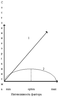 Вышесказанное может быть выражено и более простой кривой (рис. 3), в двух координатах, где по оси абсцисс отложена интенсивность фактора, а по оси ординат - изменение состояния организма «теоретически» оно бы шло по прямой (1), но действительное действие фактора оказывается иным (2). Диапазоном действия фактора являются такие его интенсивности, в пределах которых может существовать организм.