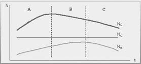 В екосистемах формуються найскладніші ланцюги і сіті причинно-наслідкових зв'язків, засновані на механізмі зворотного зв'язку, які часто утворюють замкнуті кільця, іменовані контуром зворотного зв'язку. Найпростішим прикладом такого контура служить модель "хижак-жертва (вовки - північні олені). Зобразимо графічно динаміку їх численностей (N) залежно від часу (t) (рис.2). На відрізку часу А збільшення чисельності оленів (NО) унаслідок сприятливихумов, перш за все кормових, приведе до збільшення чисельності вовків (NВ). Внаслідок цього поголів'я оленів стане менше (відрізок В), що веде до зменшення популяції хижака (відрізок З). Таким чином, чисельності "хижака" і "жертви" взаимозависимы і утворюють контур зворотного зв'язку: